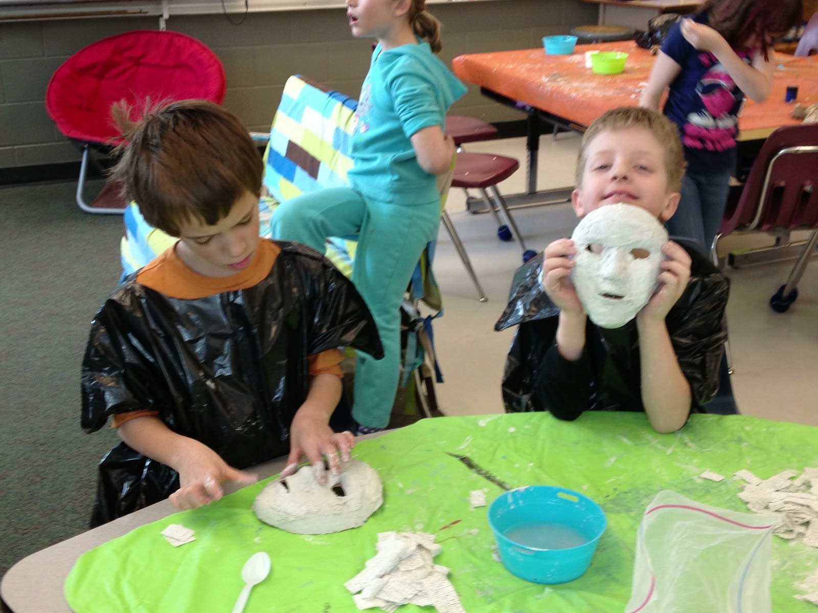 We made some really awesome Egyptian death masks! First we covered some plastic masks with vaseline. Then we covered them in cast plaster. We had to wet the cast plaster so that it would stick. It was really messy! Then we let them dry. Next, we went outside to spray paint them gold. It was hard to push the button on the spray paint can so Mrs. Shabaga and Mrs. M. had to take over the spray painting. After that, Mrs. Shabaga gave us a nemes and beard to colour with metallic markers. We used black permanent markers to draw the kohl eyeliner around the eyes of the gold mask and we drew on eyebrows. Then we coloured a cobra and vulture to go on the top of the nemes. Hot glue was used to glue the nemes, beard, cobra & vulture to the mask. Finally, Mrs. Shabaga put our masterpieces up on the bulletin board in the hallway for everyone to admire!